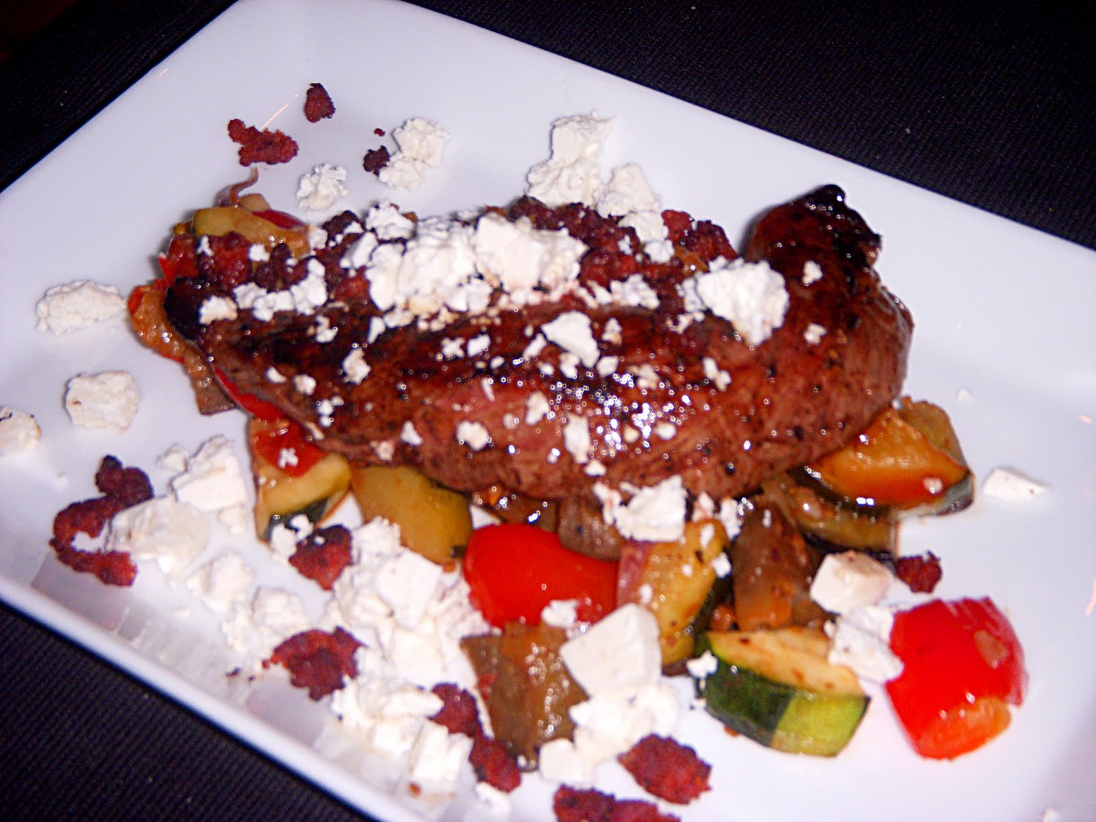 Marinerad lammfilé med chorizoströssel. fetaost och fuskratatouille